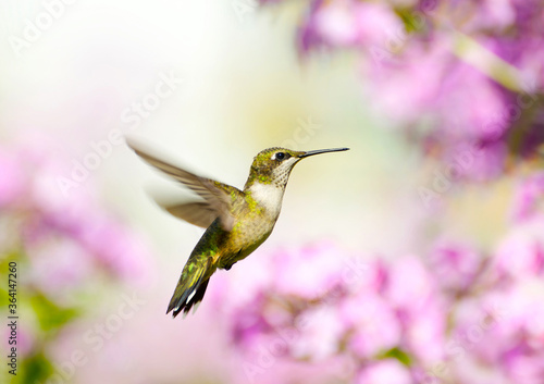 © kellyplz, Obraz premium Ruby throated hummingbird in motion.