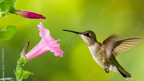 © bo tang, Naklejka premium Ruby-throated Hummingbird (Male) with a Mandevilla Flower