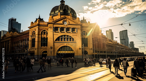Naklejka premium Ruchliwa ulica miejska, obok dużego budynku przejeżdża tramwaj.