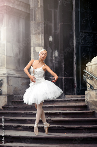 © serhiibobyk, Naklejka premium Ruchy łaski. Nieostrość strzał młodej tancerki baletowej praktykujących na klatce schodowej w starym budynku