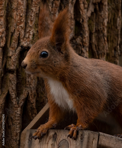Fototapeta premium ruda wiewiórka na drzewie błyszczące oczy