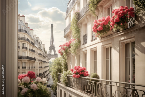 Naklejka premium Rue de Paris avec des immeubles Haussmanniens avec des balcons fleuris de géraniums et une vue sur la Tour Eiffel
