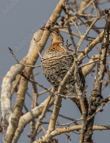 Fototapeta premium ruffed grouse in tree top eating seeds