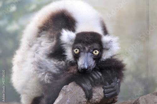 © ZhouEka, Naklejka premium Ruffed-lemur crouching on rock, largest lemur
