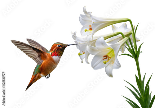 © Scenic Vault , Naklejka premium Rufous hummingbird flying near white lily flowers pollination nectar nature wildlife photography birding isolated on transparent background