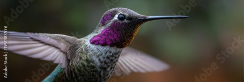 Fototapeta premium Rufous hummingbird male closeup portrait vibrant gorget iridescent wings hovering profile