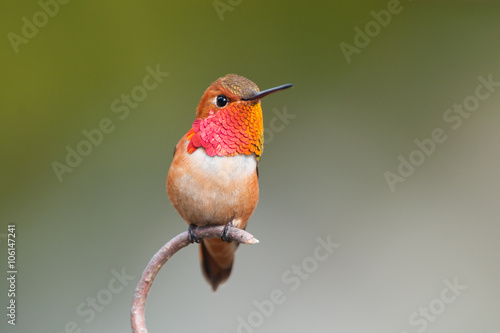 © birdiegal, Naklejka premium Rufous Hummingbird, Male. sitting on a Branch, with green backgriound