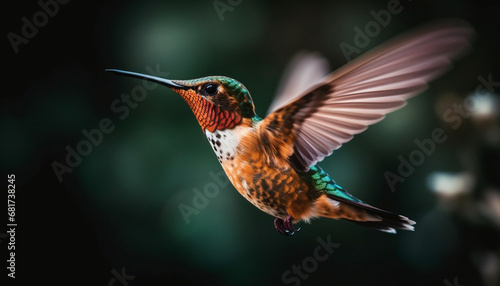 Obraz premium Rufous hummingbird spreads wings, hovering mid air, pollinating vibrant flowers generated by AI