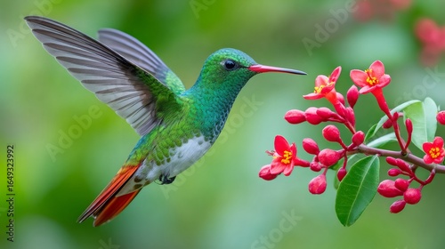 Fototapeta premium Rufous tailed hummingbird hovering near red flowers with blurred green background