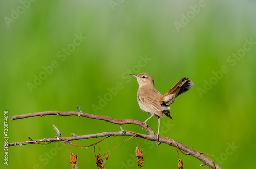 Fototapeta premium Rufous-tailed Scrub Robin on a branch. Cercotrichas galactotes. Green background.