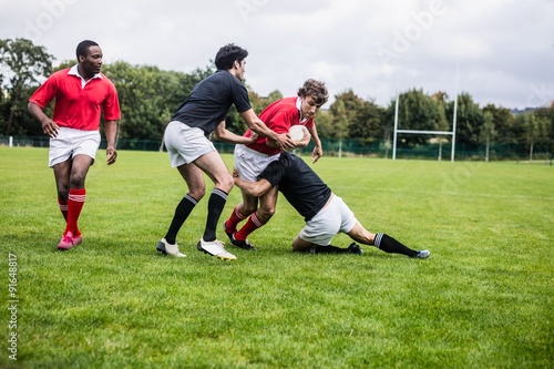 © WavebreakMediaMicro, Obraz premium Rugby players tackling during game