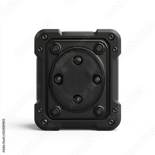Fototapeta premium rugged Bluetooth speaker in black with rubberized edges and water-resistant features, centered on a clean white background