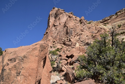 Fototapeta premium Rugged cliff with sparse vegetation against a clear blue sky. Colorado...