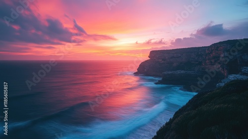 Fototapeta premium Rugged coastal cliffs at sunset with vibrant red sky reflecting on blurred...