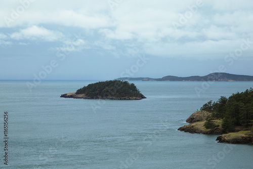© daniel, Fototapeta premium Rugged coastal cliffs meet calm ocean waters under soft cloudy blue sky