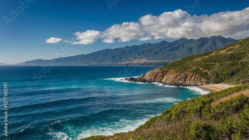 © xeionise, Fototapeta premium Rugged Coastal Landscape with Turquoise Waves and Cliffs