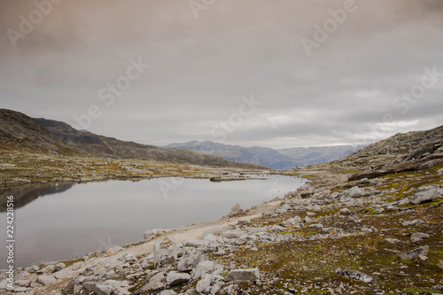 Fototapeta premium Rugged dramatic mountain landscape in norway cloudy dramatic day with calm lake