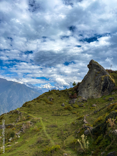 © Rohan, Fototapeta premium Rugged High-Altitude Hiking Trail Leading Past a Distinctive Rock Formation in Auli, Uttarakhand.