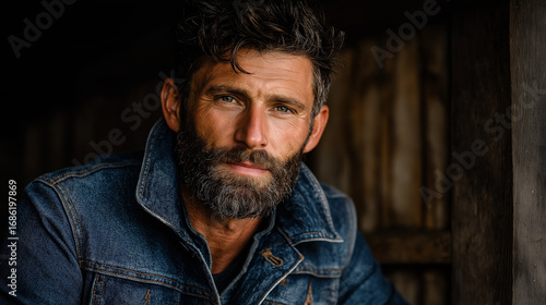 © Wasin Arsasoi, Fototapeta premium Rugged Individual in Rustic Setting: Portrait of a strong, mature individual with a weathered beard and denim jacket.