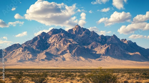 © Murda, Fototapeta premium Rugged mountains, desert landscape, blue sky, fluffy clouds.