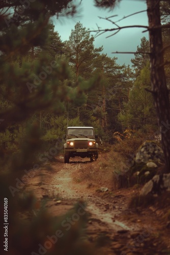 Obraz premium Rugged off-road vehicle on muddy forest path, dense foliage, adventure in...
