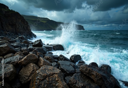 © starush, Obraz premium Rugged rocky shoreline with crashing waves under stormy sky near coastal cliffs