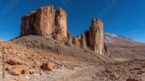 Obraz premium Rugged, towering rock formations rise from a desolate, rocky landscape under a clear blue sky