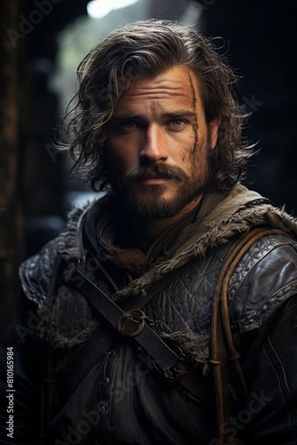 © Balaraw, Obraz premium Rugged warrior with long hair and beard in dark clothing