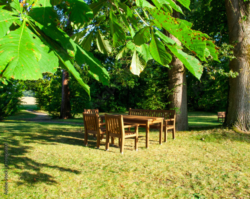 © Michelle List , Obraz premium Ruheplatz im Park - Sitzgelegenheit unter Bäumen