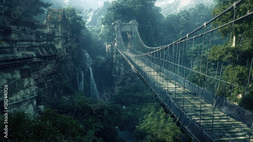Obraz premium Ruined Asian village, jungle, suspension bridge, waterfall