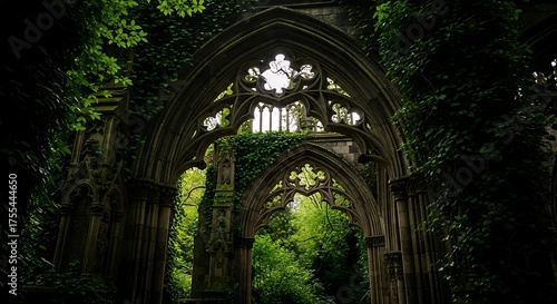 Fototapeta premium Ruined gothic arches overgrown with lush greenery