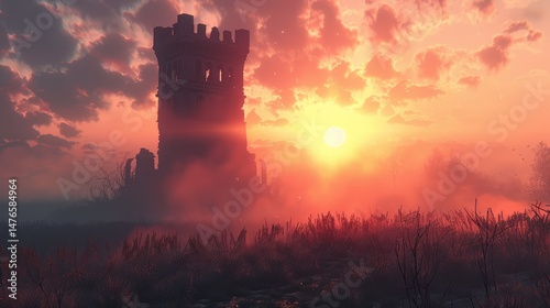 © Anak, Fototapeta premium Ruined tower at sunrise through a misty field.