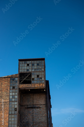 Obraz premium Ruins of an abandoned industrial plant. Brick walls against the background of the blue sky. Photo taken on a sunny day.