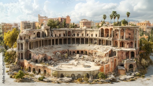 Obraz premium Ruins of an ancient amphitheater with a stone stage, surrounded by crumbling...