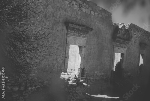 © Arturo Verea, Fototapeta premium Ruins of an ancient construction in Real de Catorce, Mexican ghost town black and white
