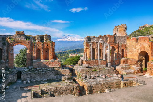Fototapeta premium Ruins of ancient Greek theater in Taormina and Etna volcano in the background.