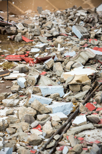 © kanpisut, Obraz premium ruins of concrete and brick wall on construction site after the building destroyed. Waste of old destroyed building
