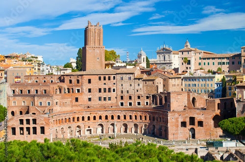 © shinedawn, Obraz premium Ruins of Mercati di Traiano, Foro Traiano among many high green trees