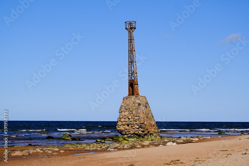 © Sandris Veveris, Fototapeta premium Ruins of the ancient Kurmrags lighthouse on the shore of the Gulf of Riga. Stone masonry in the lower part of the lighthouse, above which is the metal body of the lighthouse made in Sweden. Baltic Sea