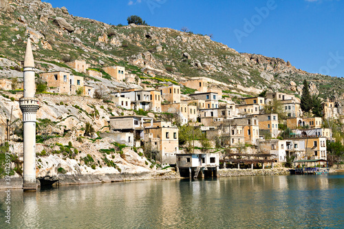 © MehmetOZB, Fototapeta premium Ruins of the town Halfeti after it remained under the reservoir of a dam built on the River Euphrates, in Sanliurfa, Turkey