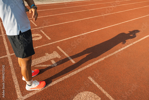 Naklejka premium Runner at track poised at the starting line casting shadow under the setting sun