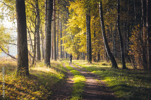 © unicornamira, Obraz premium Runner is running through colorful misty morning autumn forest during wonderful calm sunrise. Concepts: lifestyle, dawn, nature
