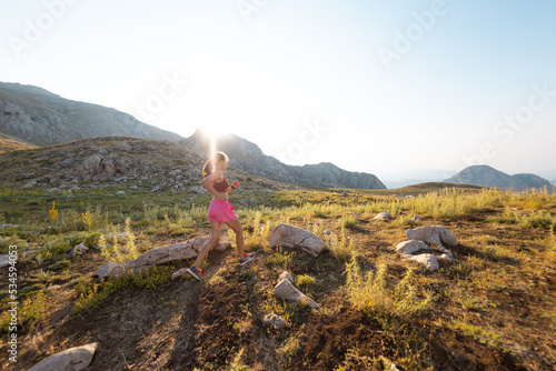 © zhukovvvlad, Naklejka premium Runner woman running through beautiful mountains