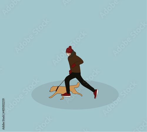 © Warunporn, Obraz premium Runner woman with her dog wearing medical mask in city streets, Covid-19 coronavirus pandemic. Sport, active life in quarantine, surgical face mask.