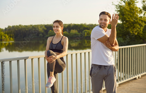 Naklejka premium Runners couple warming up and stretching before morning run in park by summer lake. Fit woman and man warm up and stretch muscles, exercises of two active athletes in sportswear. Motivation concept