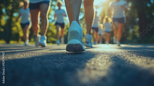 © Aziz, Fototapeta premium Runners feet, group jogging outdoors, sunny day, asphalt road.