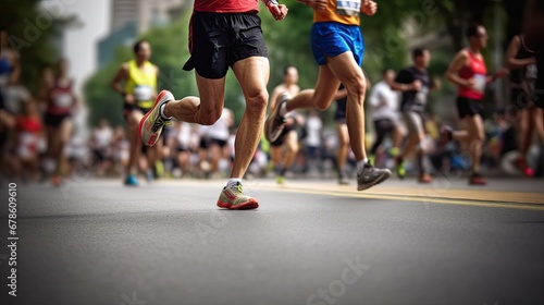 Fototapeta premium Runners running in city marathon, motion blur on sporty legs.