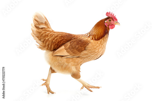 © lucky pics, Fototapeta premium Running chicken hen on white background. Neural network generated image. Not based on any actual scene or pattern.