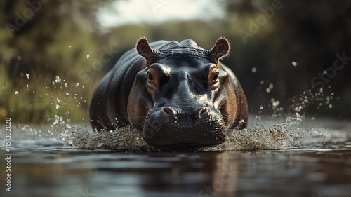 Fototapeta premium running hippo during mid-day in a river with a eye-level angle