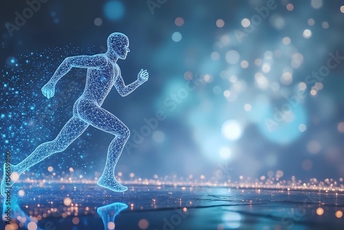 Naklejka premium Running Man in glowing polygonal connection dots with futuristic silver...